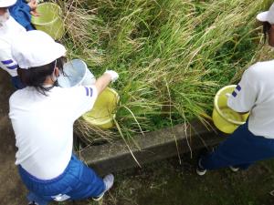 5年生が稲刈り体験を行いました。アイガモ農法の米づくりを体験させていただいている北野さんをはじめ、たくさんの方にご指導いただきました。鎌による稲刈りから脱穀やコンバインによる稲刈りなどを体験させていただきました。学校に戻ってからは花壇で育てた稲を刈りました。学校で育てた稲からはバケツ1杯ほどのお米が採れました。