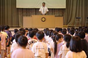 校長先生からは、(1)1学期にがんばったことをふり返ってほしいこと。(2)夏休みは、「ゆっくり体を休めてほしい」「いろいろな体験をしてほしい」。(3)9月1日(金)に元気に学校に来てほしいこと、という話がありました。