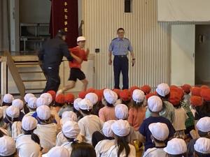 6月6日(木)不審者が侵入した想定で避難訓練を行いました。避難後に下妻警察署の方からお話をしていただき、「いかのおすし」の確認と、代表児童による不審者に遭遇した場合のロールプレイで対応の仕方を学習しました。